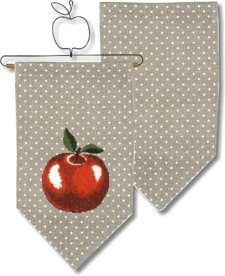 Fertig genähter Behang aus dunklem Leinen mit aufgedruckten weißen Punkten, zum Besticken. Am oberen Ende ist ein Tunnel eingearbeitet, der untere Teil ist zu einer Spitze ausgearbeitet. Der Behang ist ca 16 cm breit und ca 30 cm lang - gemessen vomTunnelbeginn bis zur Spitze. Sehr hübsch können unsere Mini- und Midimotive auf den Behang gestickt werden. Einen tollen Akzent setzt ein Drahtbügel als Aufhängung. In unserem Beispiel haben wir das Motiv MD-168-11 Riesenapfel auf den Behang gestickt und an den Drahtbügel DH-Apfel gehängt. Kombinieren Sie Ihre Lieblingsmotive und freuen Sie sich über eine gelungene Komposition. Viel Spaß! Achtung: Farbabweichungen sind durch die shop Darstellung möglich