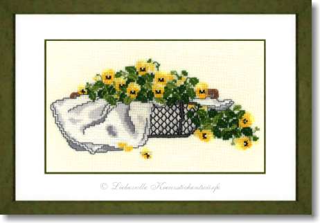 Ein wahres Prachtstück ist dieser Drahtkorb mit dem weißen Leinentuch. Frisch bepflanzt mit gelben Stiefmütterchen holen Sie sich hier Ihren Landhausgarten ins Wohnzimmer..