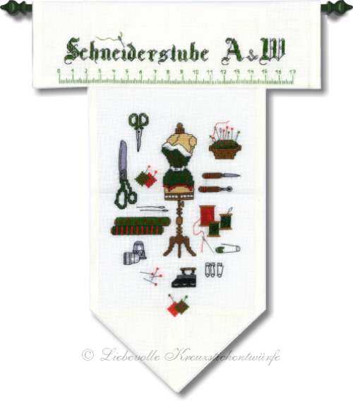 Sehr dekorativ ist das Schneidermustertuch zusammen mit dem passenden Holzhänger. Die Packung enthält den Stoff inklusiv einer Nähanleitung für den Behang, das Garn sowie die Stickanleitung mit einem kompletten Alphabet für Ihre individuelle Gestaltung mit den eigenen Initialen.