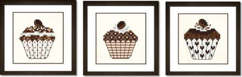 Die Stickpackung beinhaltet die Anleitung mit Material für alle 3 Schokomuffins. Wenn Sie unseren Vorschlag für die einzelne Rahmung der Motive hübsch finden, dann teilen Sie das beigefügte Leinenstück in entsprechend große Teile.