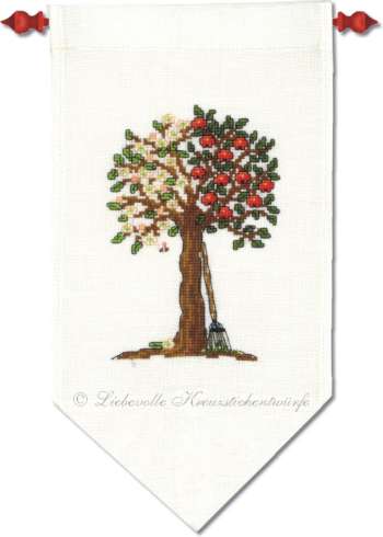 In unserem Beispiel ist der Apfelbaum als Wandbehang mit Holzaufhängung ausgearbeitet. Eine Nähanleitung für den Behang finden Sie in der Packung. Der rot lackierte Holzhänger mit Endknöpfen kann bei uns bestellt werden.