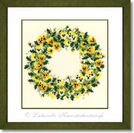 Ein Motiv für Stickprofis und eine Herausforderung für Anfänger ist dieser Stiefmütterchenkranz in zarten Gelb- und Grüntönen. Ein Meisterwerk auf das Sie zu Recht stolz sein können, wenn es schön gerahmt Ihr Heim schmückt.